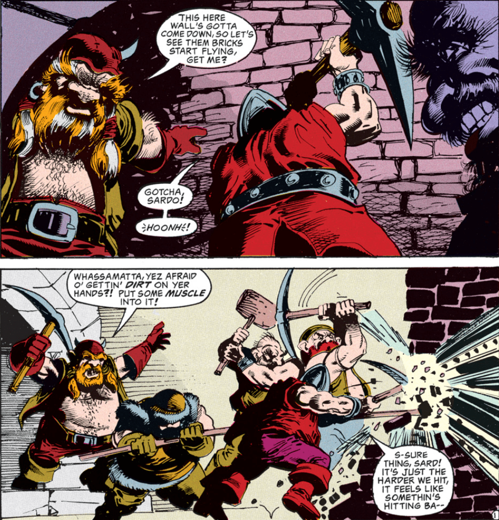 In a tale as old as, well…at least Tolkien, the dwarves dig too greedily and too deep, awakening something best left alone. Luckily, it’s not a balrog in this case but rather an air elemental. It’s still nasty enough to scatter the dwarves and give their leader a nasty bump on the noggin.