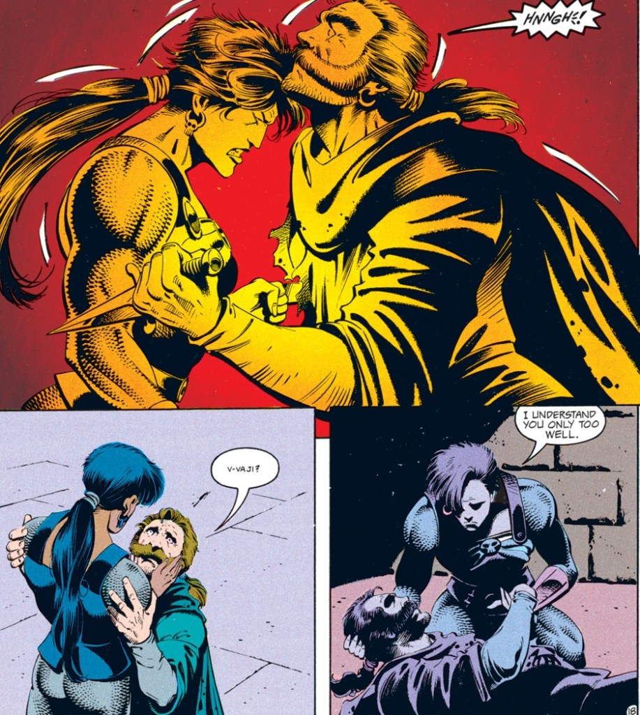 On the other hand, this turn of fortune feels a little hollow to me. Maybe I’m just wishing that Conner actually had a moment of realization himself and changed his ways. Instead, he betrays the one scruple he ever had, drawing a hidden dagger in a last, desperate attempt to kill Vajra and save his own hide.