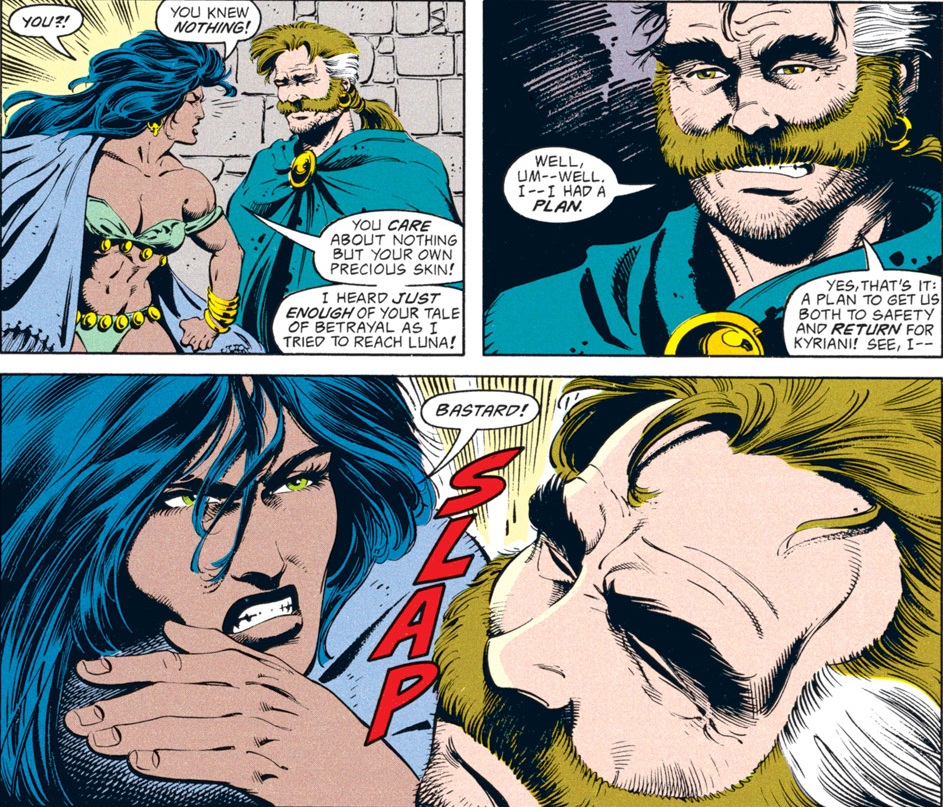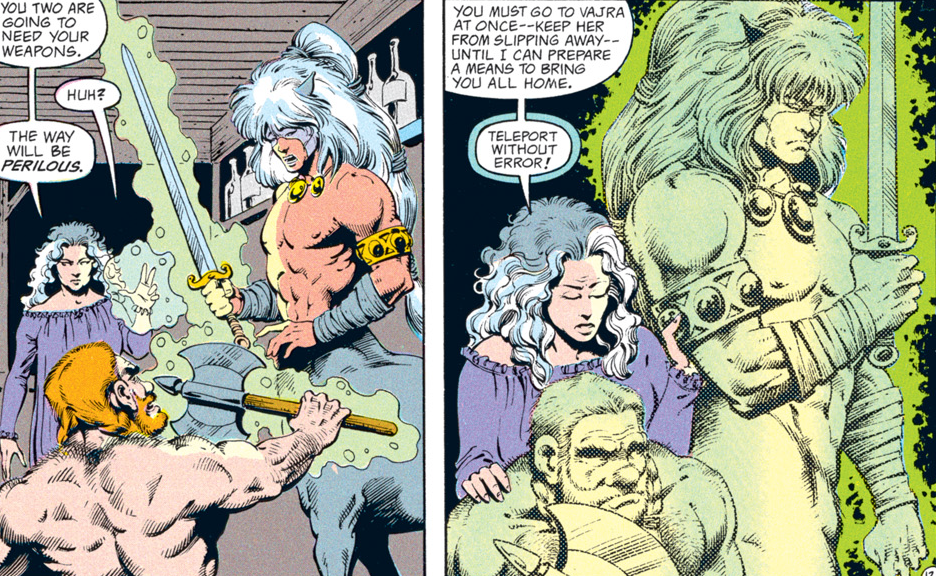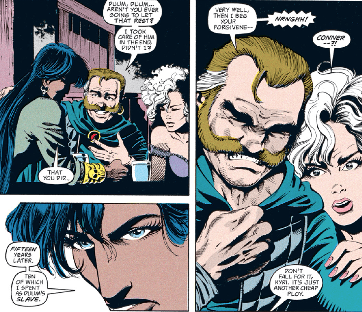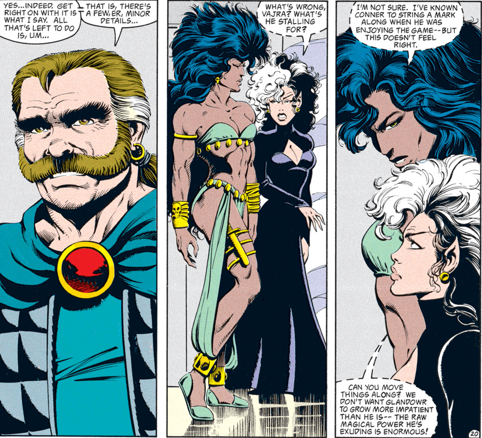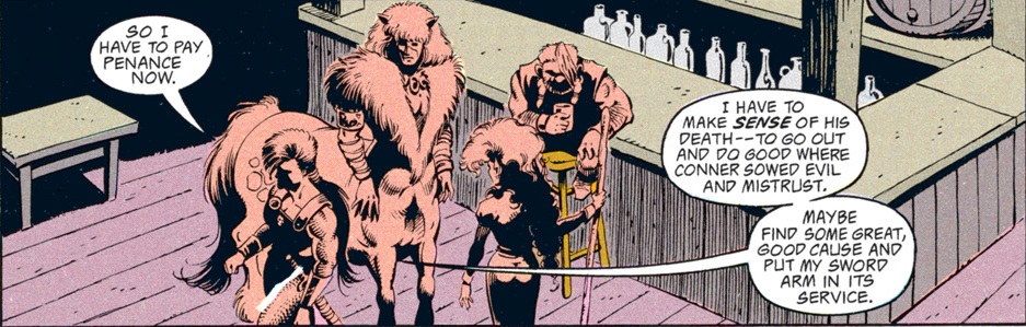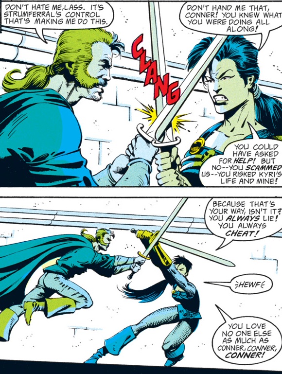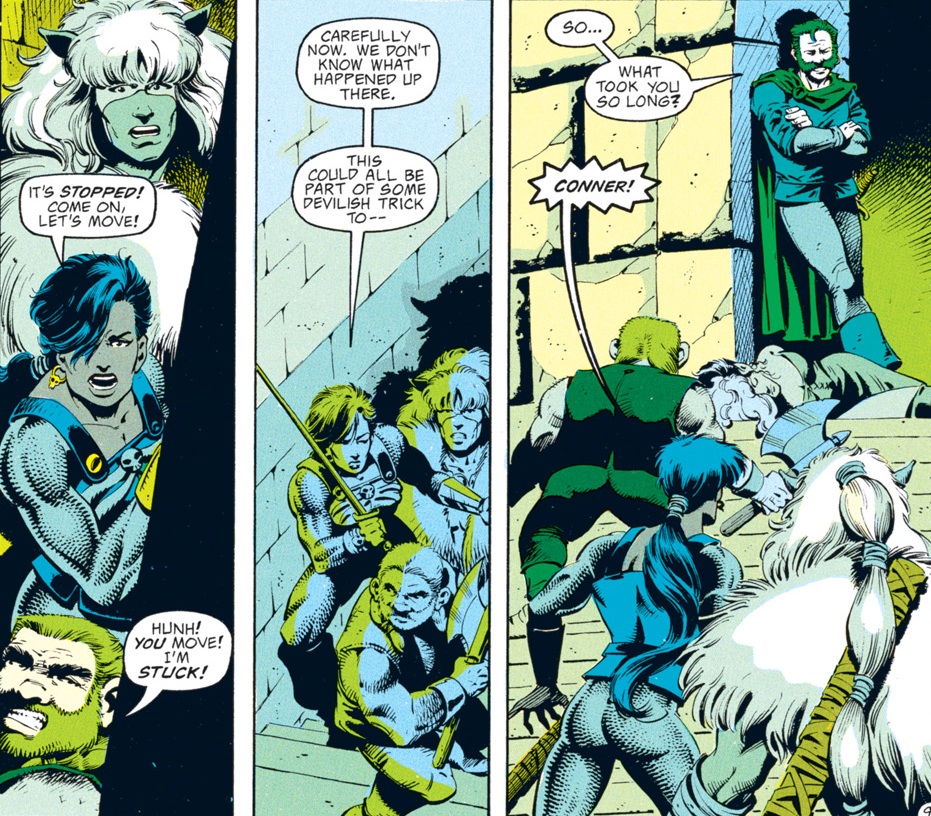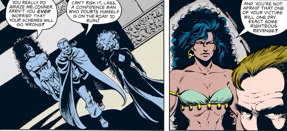 The rest of the group is pretty suspicious of Conner for a change. I had to double-check to make sure that Dan Mishkin, the writer of this arc, is the same guy who wrote “Spell Games,” which went way out of its way to portray Conner as a dashing rogue who was a step ahead of even the gods and had everyone’s respect. Maybe Mishkin had the same misgivings I had about Conner’s betrayal then…or maybe, like the character himself, the author changed with time.