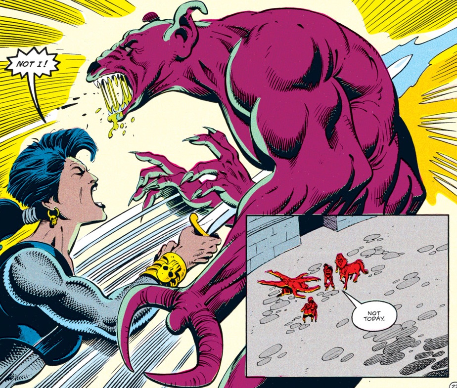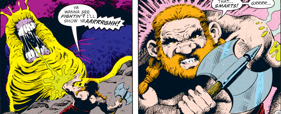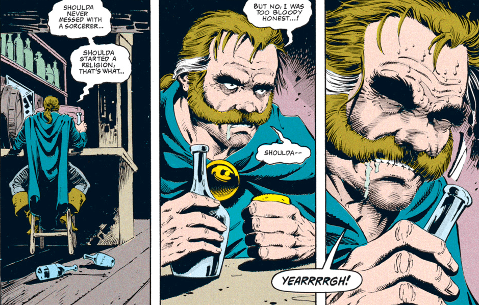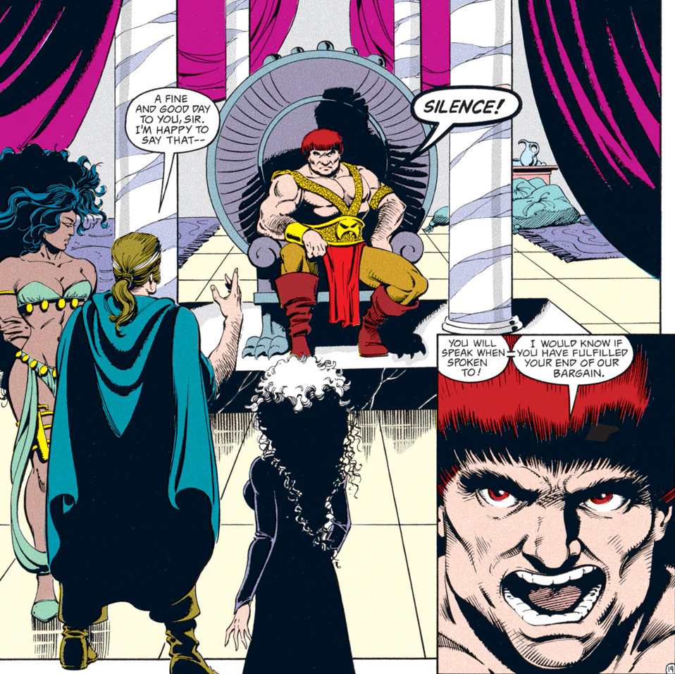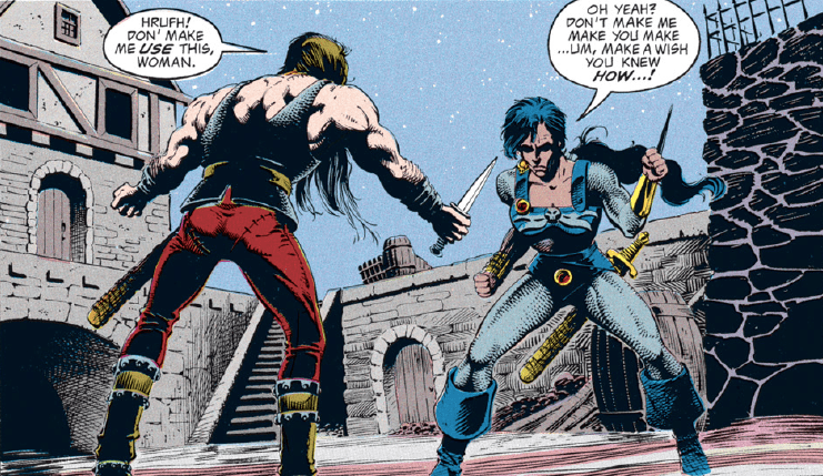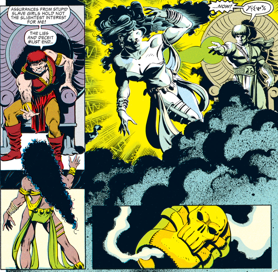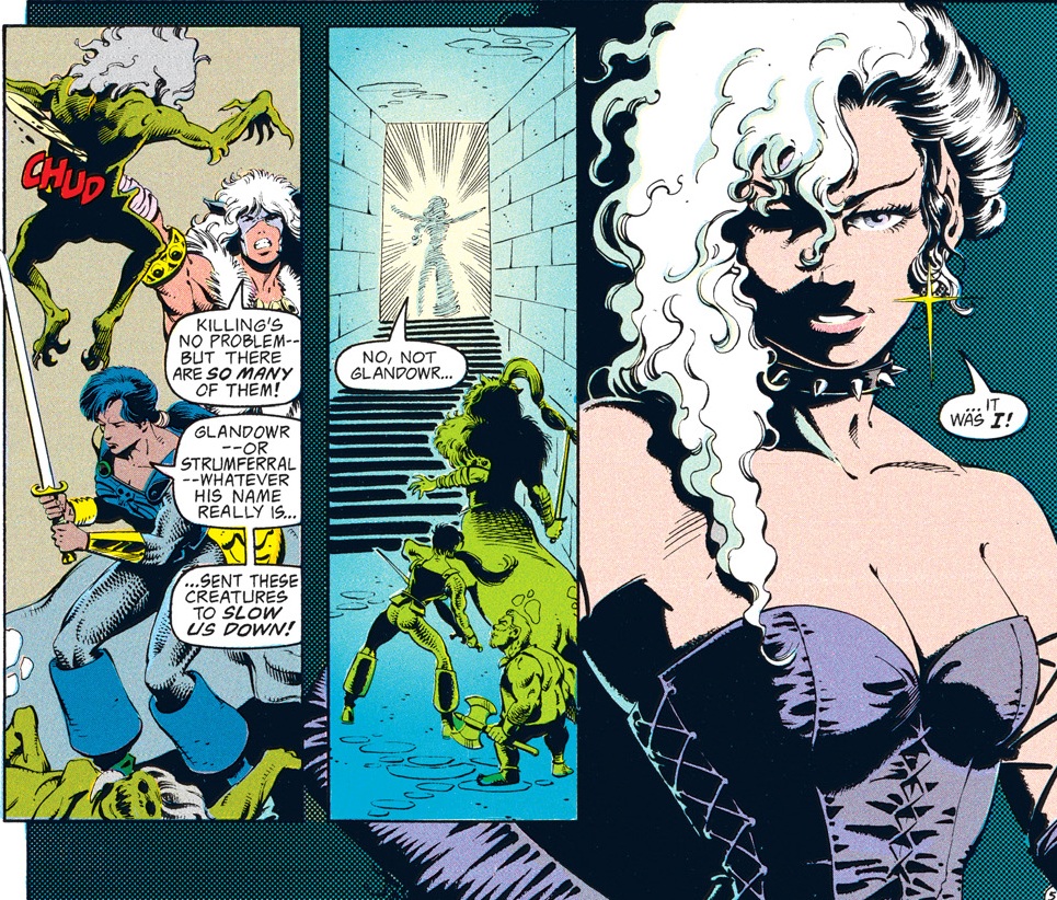 The rest of the group is pretty suspicious of Conner for a change. I had to double-check to make sure that Dan Mishkin, the writer of this arc, is the same guy who wrote “Spell Games,” which went way out of its way to portray Conner as a dashing rogue who was a step ahead of even the gods and had everyone’s respect. Maybe Mishkin had the same misgivings I had about Conner’s betrayal then…or maybe, like the character himself, the author changed with time.