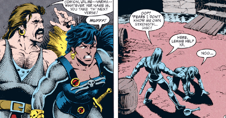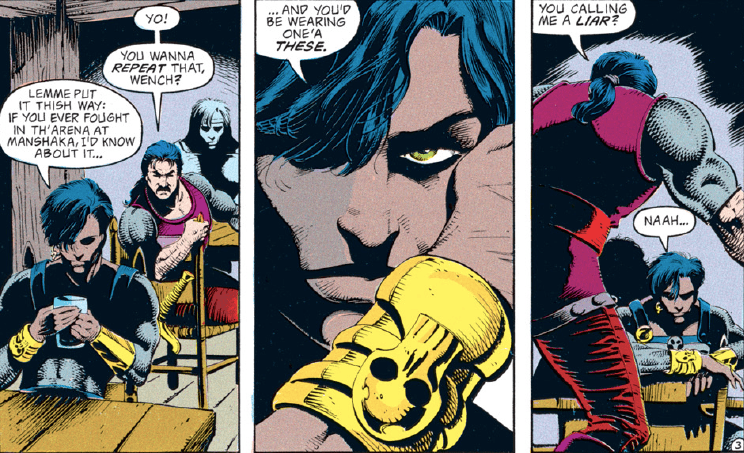Luckily, the other members of the drinking gang intervene and cooler heads prevail…or at least they do until the group gets to their next bar. There, Vajra overhears someone claiming that they survived the slave pits of Manshaka. Having experienced those pits firsthand, she has some choice words to say.
