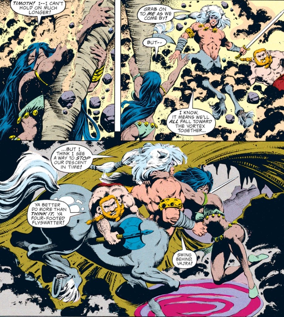 Angered by the acid breath of the slug, Onyx gives it what-for and chases it away. The pair then finds Vajra clinging from a stalactite and about to fall into a planar vortex.