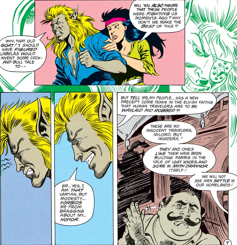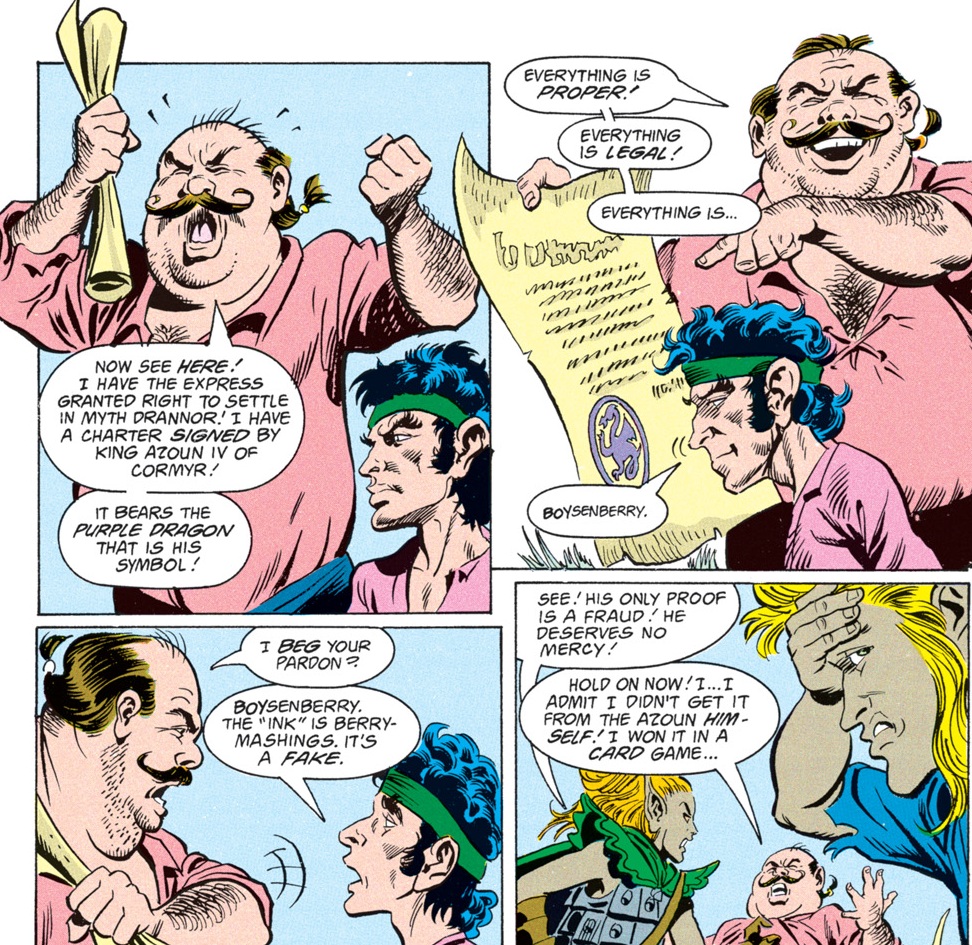The elves are fighting because the humans want to settle in Myth Drannor, an area where carefully-negotiated contracts with the neighboring kingdoms of Cormyr and Sembia forbid human trespass. One of the settlers produces a charter indicating that King Azoun of Cormyr has given permission to found a town in the area, but Foxy knows a forgery when he sees one.