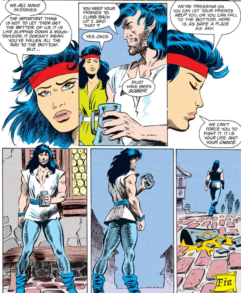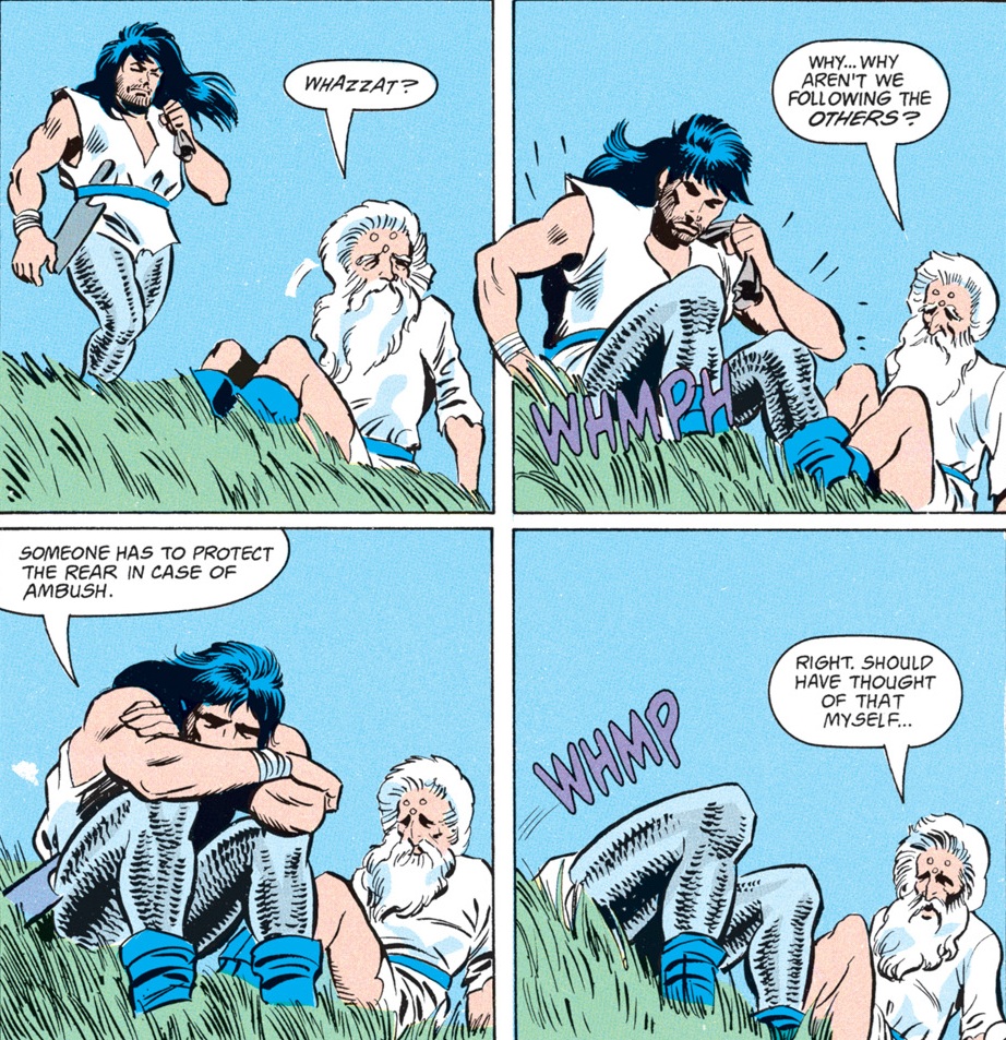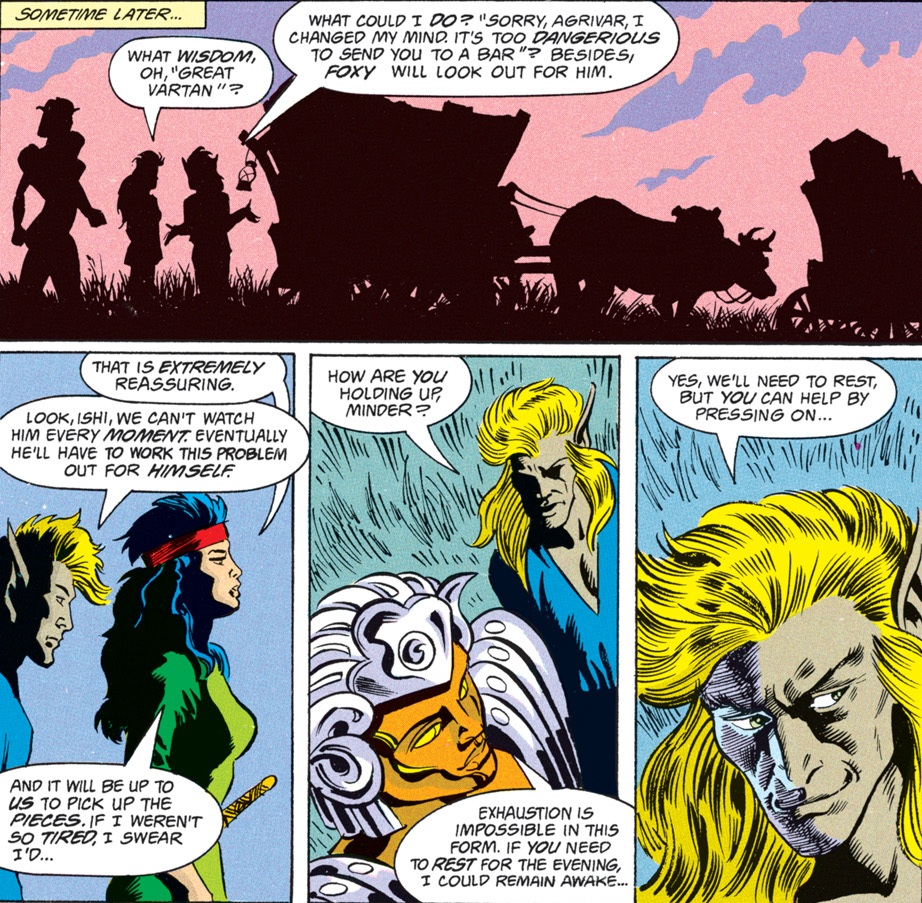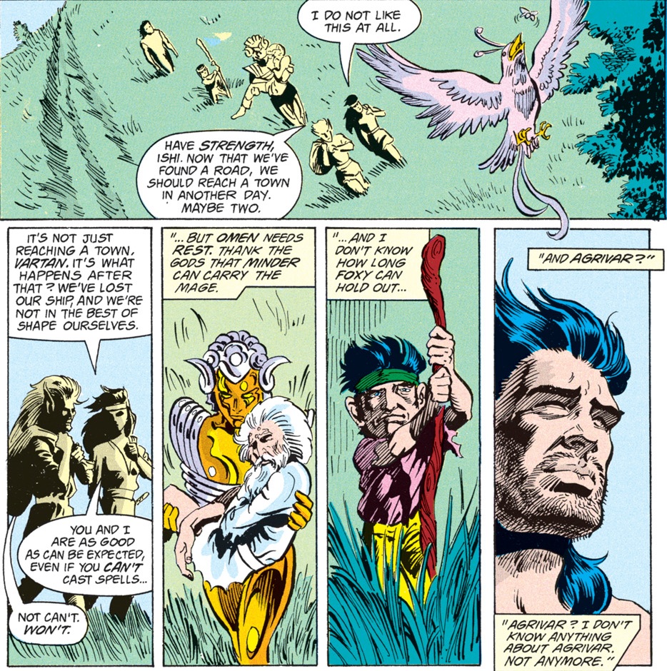 The crew apparently walked all the way out of the Anauroch Desert since their last issue, which is a long trip. Ishi and Agrivar, whose love story was the focus of many a subplot up until now, have barely spoken because the former doesn’t know how to deal with the latter’s relapse into alcoholism. Luckily, a fight always serves as a great distraction, and when the group sees some bandits attacking innocents, they rush into the fray.