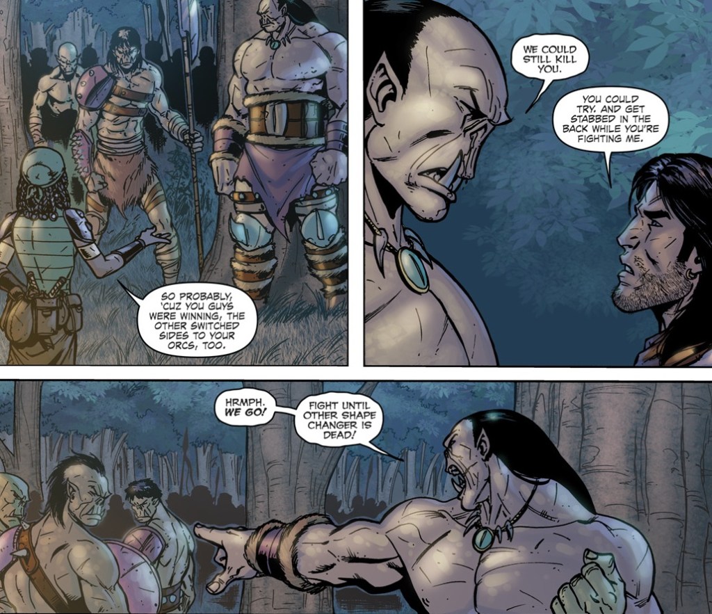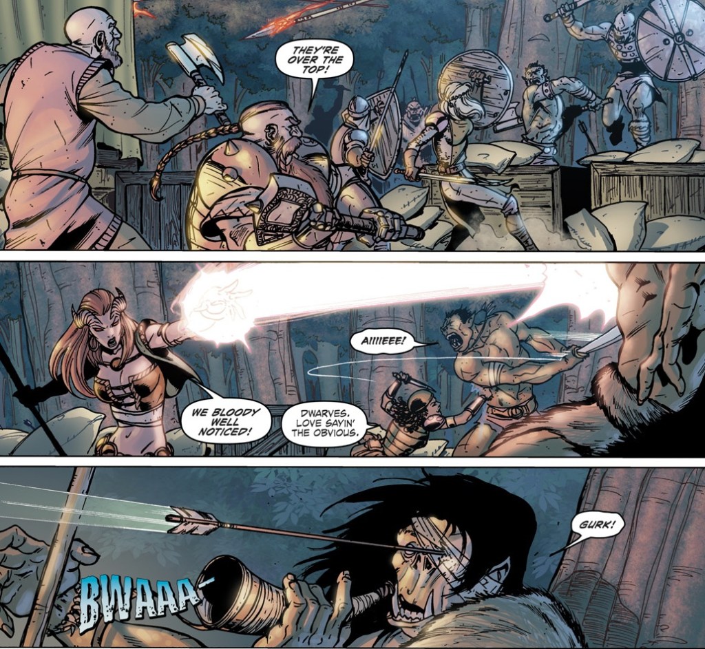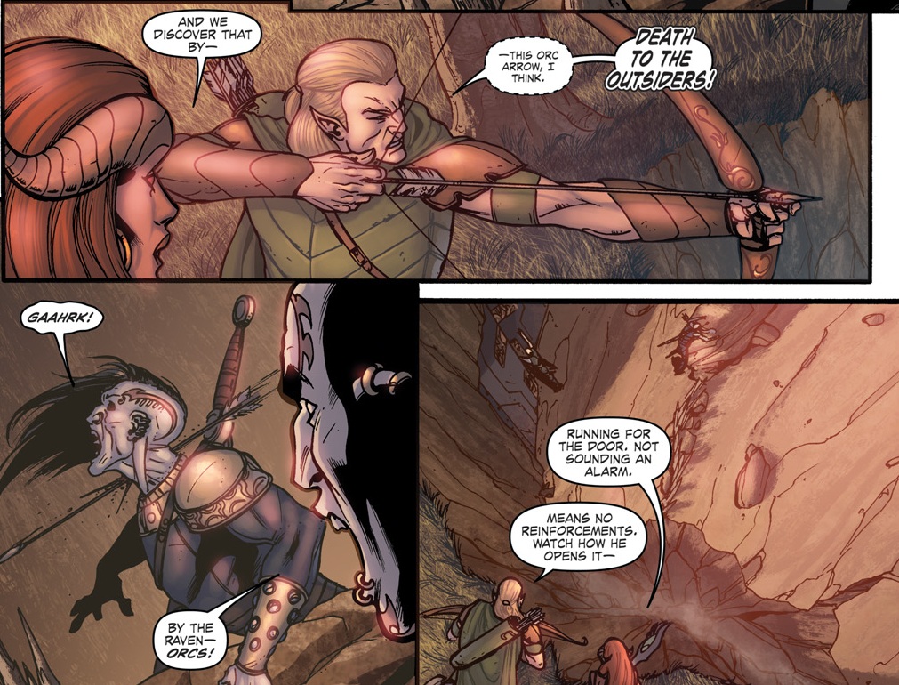 I kind of think it’s funny that orcs are apparently immediately identifiable by the arrows they shoot. I guess that goes back to the black-feathered arrows from The Lord of the Rings, but it’s funny to me that a guy from another dimension can see an arrow and immediately go, “Orcs!”