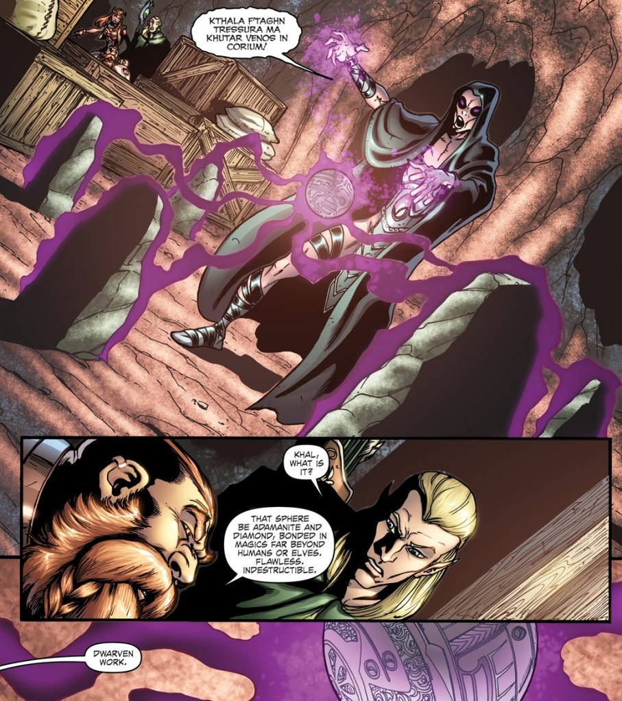 While I love the humor and the fast pace of the action, I do miss seeing the heroes during their off-hours at Selûne’s Smile or aboard the Realms Master. But that’s the nature of modern comics; there’s much more action and much less time to slow down and take things in. It’s also the nature of 4th edition D&D; very rarely did we see art that showed adventurers traveling or enjoying themselves at a tavern. Instead, the edition was almost wall-to-wall with action scenes and big combats.