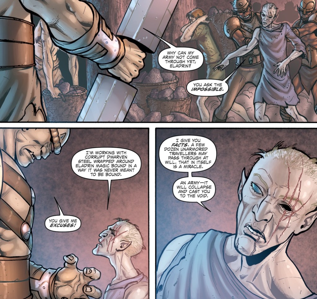 The cyclops is using eladrin slaves to allow his army to pass through the portal, but it’s not working well enough to allow a sizeable force through. This is probably why the doppelganger was running around with a world key of his own.