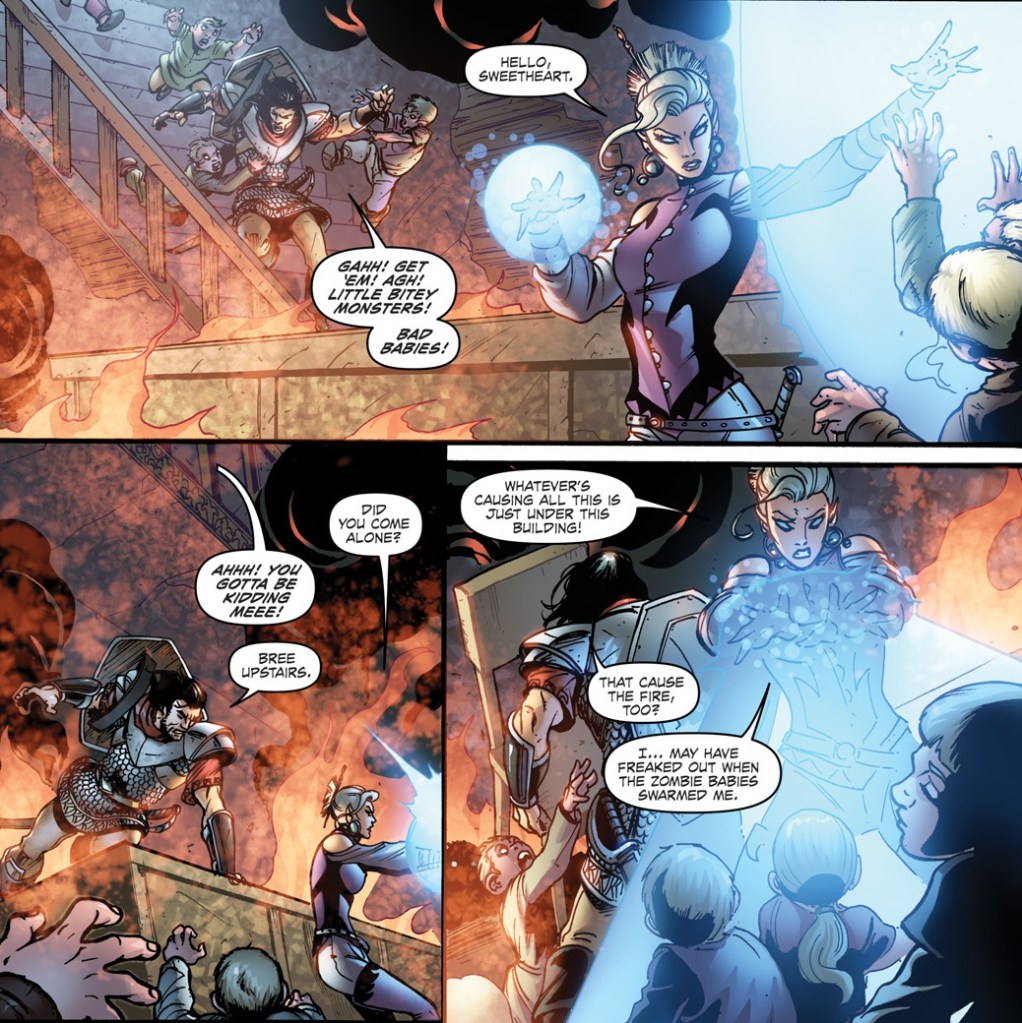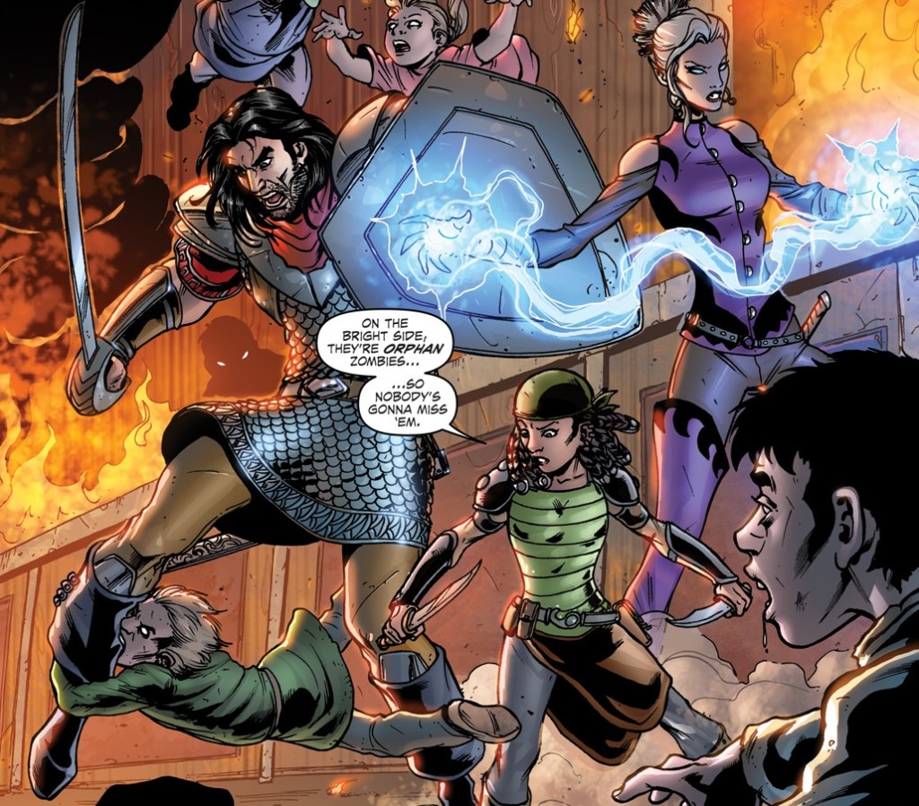 In keeping with making this comic feel like an action movie, we start in media res, with Adric Fell and Bree Three-Hands fighting zombie orphans. Through narration, Adric breaks the fourth wall and says, “To be fair, you’re coming in late.”