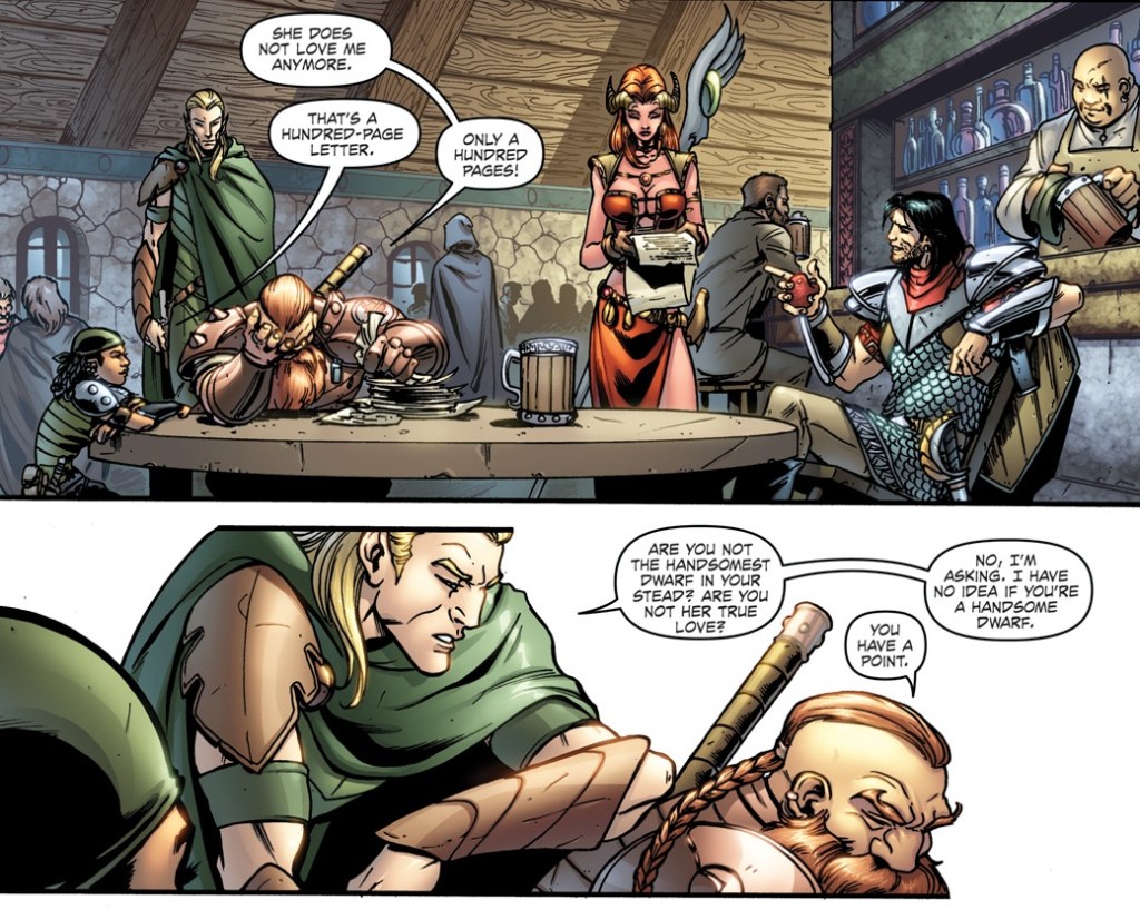We flash back to earlier in the day, with the group enjoying some time at a tavern. (The tavern is called The Staggered Goat, but sadly won’t become a regular feature in this comic like Selûne’s Smile was in Advanced Dungeons & Dragons.) Khal has received a love letter from home, but is despondent because it’s not long enough.