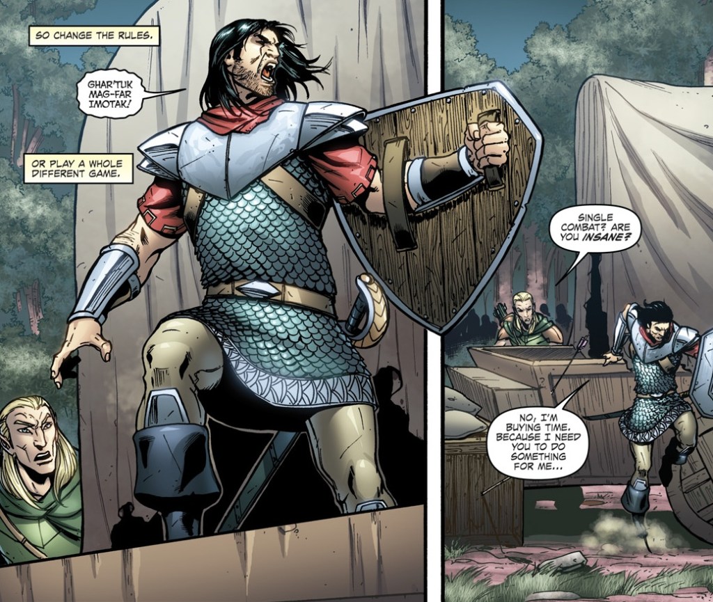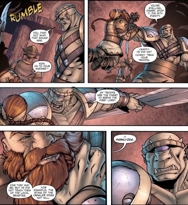 With Grunh off-balance because of Adric’s kiss, the tide of battle turns. Unfortunately, the orc priest goes against orders and sounds the attack.