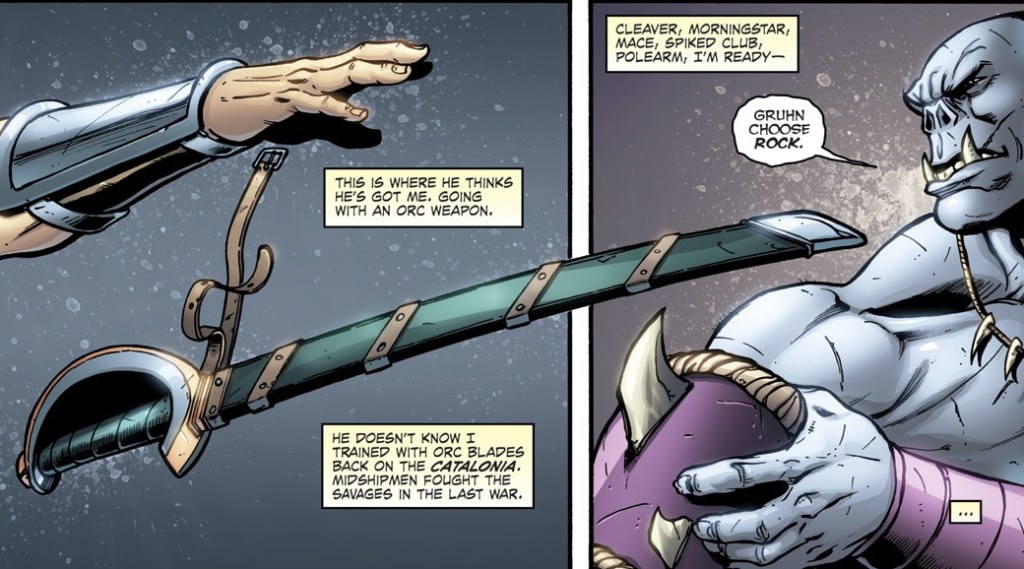 The orc chieftain, Gruhn, gets to choose the weapons for the duel. Adris thinks this will work to his advantage because he’s trained in all the traditional orc weapons.