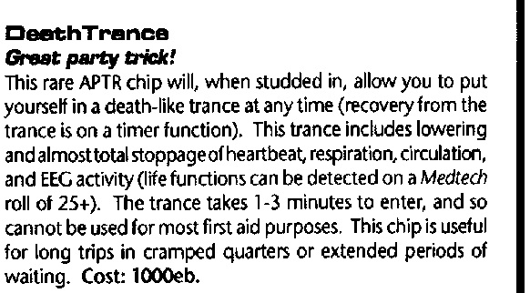 Finally, there’s the DeathTrance chip. This chip allows you to go into a death-like state for a set period of time. It’s advertised as a “Great party trick!” and costs 1,000 Eurobucks. One Eurobuck in Cyberpunk 2020 is equal to about two US dollars. That means you’re shelling out $2,000 for a party trick. For that kind of money, you could get a sweet 48 MHz laptop computer.