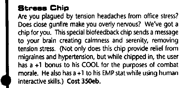 Then there’s the Stress Chip, which places close gunfire at the same frequency and tension level as office stress. Moving to a new neighborhood where people didn’t fire guns outside your window on a nightly basis would cost you way too much. For a mere 350 Eurobucks, you can get a chip that will keep you calm even when some drugged-out psycho points a Glock at your head!