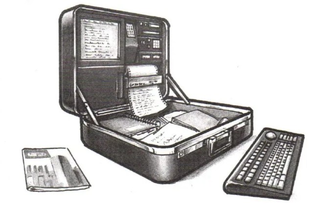 The Advanced Communications Suitcase is a “sophisticated system…with a 48 MHz personal computer.” Later on, we get the Office Communications Suite, which allows seamless transition between an office phone, fax, and answering machine. Best of all, “a built-in switching device selects between fax and voice transmissions automatically, preventing the annoyance of hearing the fax tone when you pick up the phone.”